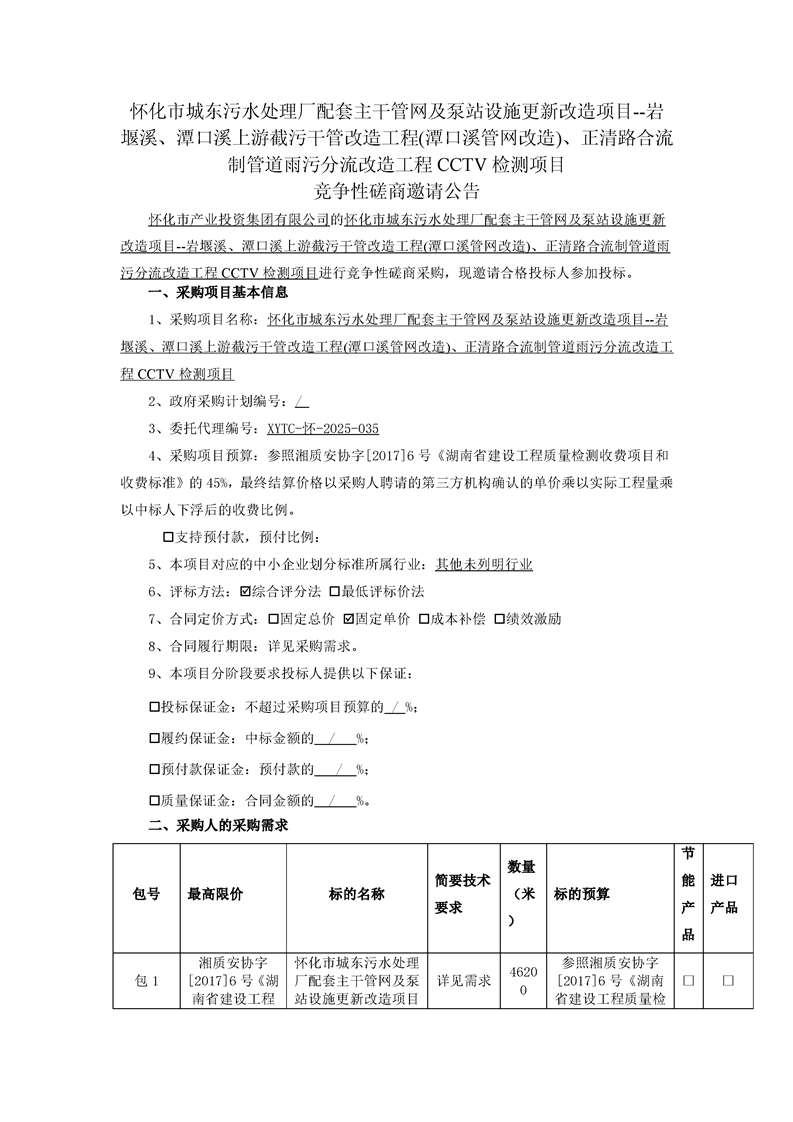 懷化市產(chǎn)業(yè)投資集團(tuán)有限公司的懷化市城東污水處理廠配套主干管網(wǎng)及泵站設(shè)施更新改造項(xiàng)目--巖堰溪、潭口溪上游截污干管改造工程(潭口溪管網(wǎng)改造)、正清路合流制管道雨污分流改造工程CCTV檢測項(xiàng)目競爭性磋商邀請公告