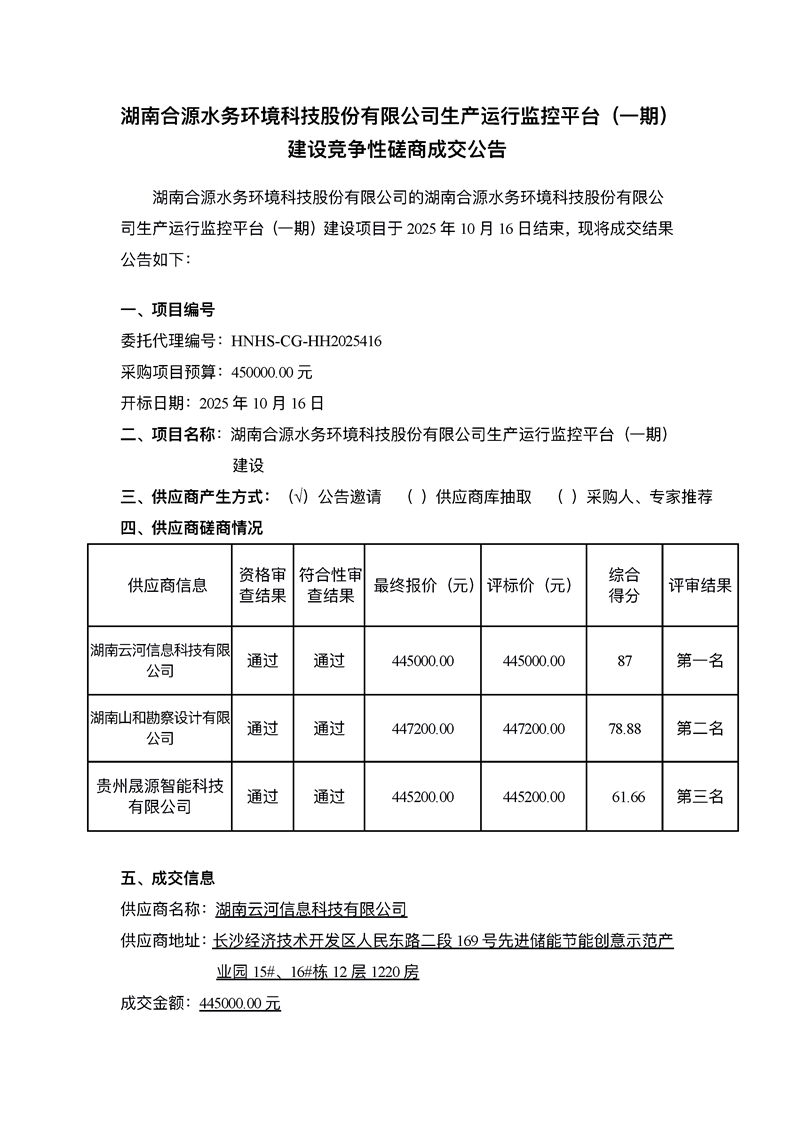 湖南合源務(wù)環(huán)境科技股份有限公司產(chǎn)運監(jiān)控平臺(一期)建設(shè)競爭性磋商成交公告